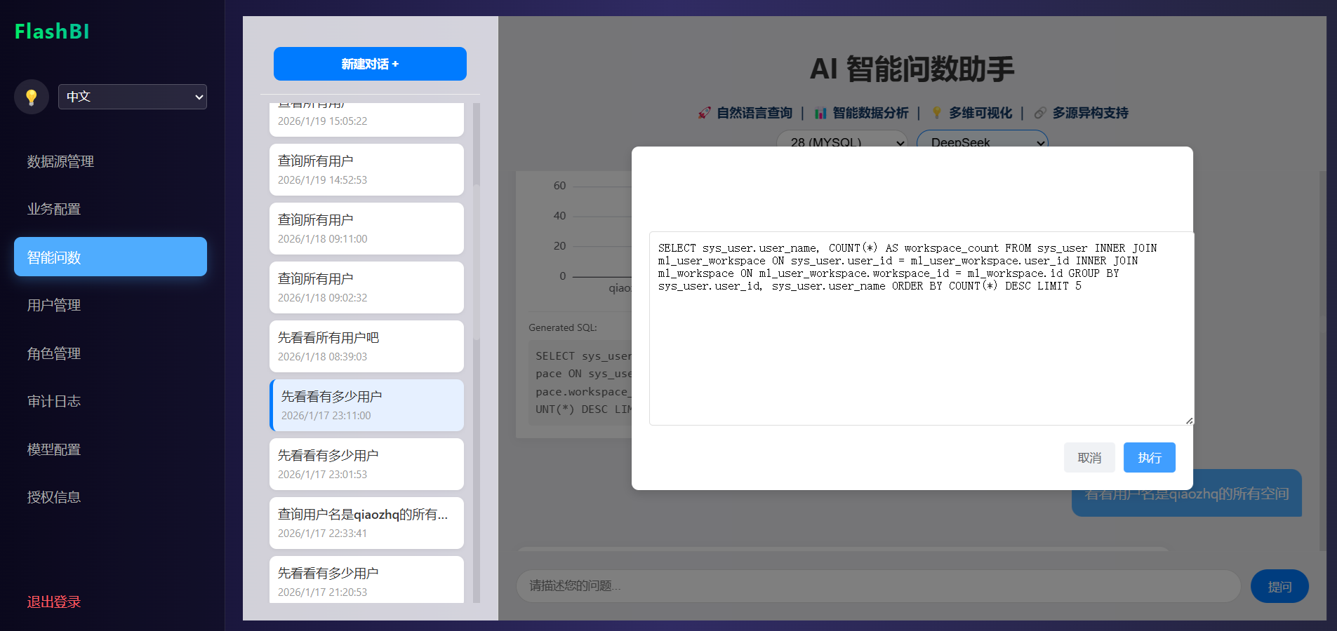FlashBI 是新一代 ChatBI 平台。基于大语言模型连接 MySQL、PostgreSQL、HANA 等多种数据源,支持智能问数与自然语言查询,让数据分析像聊天一样简单。